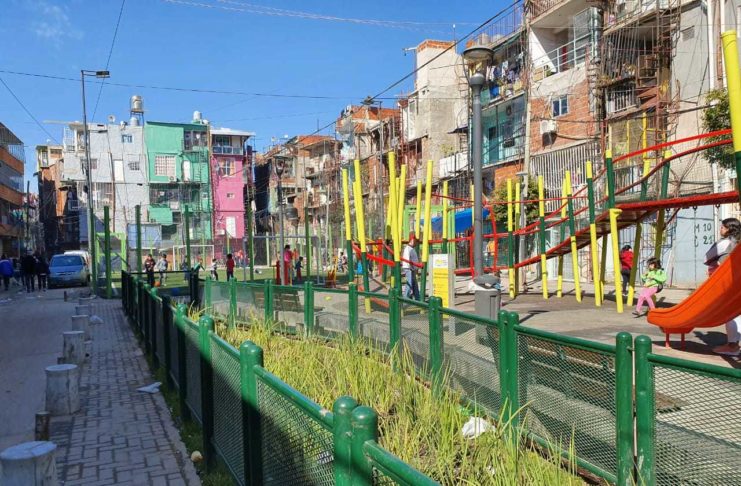 Ya de noche y con las luces prendidas que iluminan los pasillos, los vecinos del barrio arman parrillas al ras del piso donde hacen asado o preparan lo que pudieron comprar con el salario quincenal. Los más chicos corren pateando la pelota en las nuevas plazas con juegos de colores y piso de goma. De fondo se escuchan los goles en un partido improvisado. Todos logrados por un solo jugador: Messi.